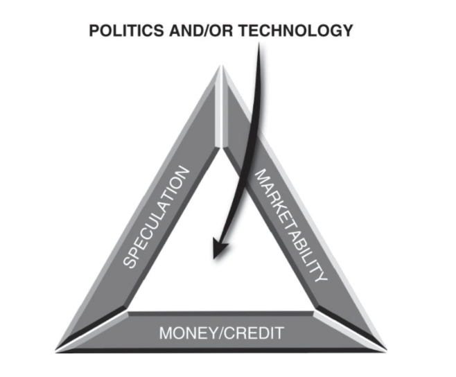 This framework starts with the proposition that in order to have a fire, you need oxygen, fuel and heat. From there, they argue that fires are actually analogous to how bubbles form and that the necessary conditions for a bubble include marketability, money/credit, and speculation.