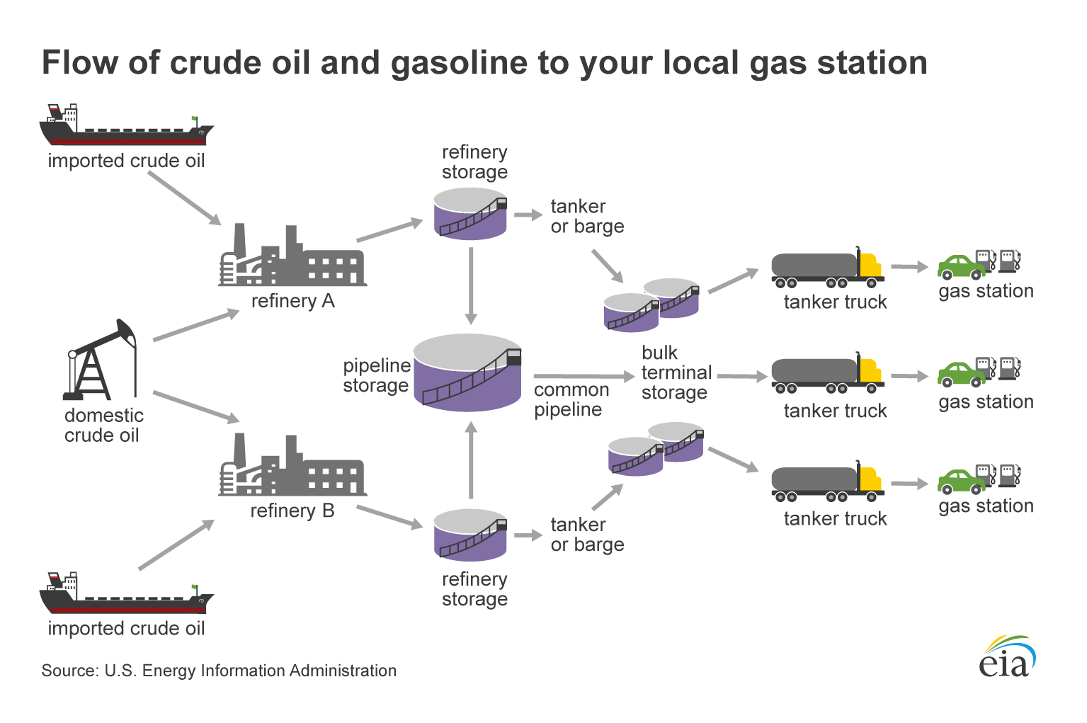 You'll recall that oil is a key input to the gasoline that we fill at the pump (simplified supply chain shown below).