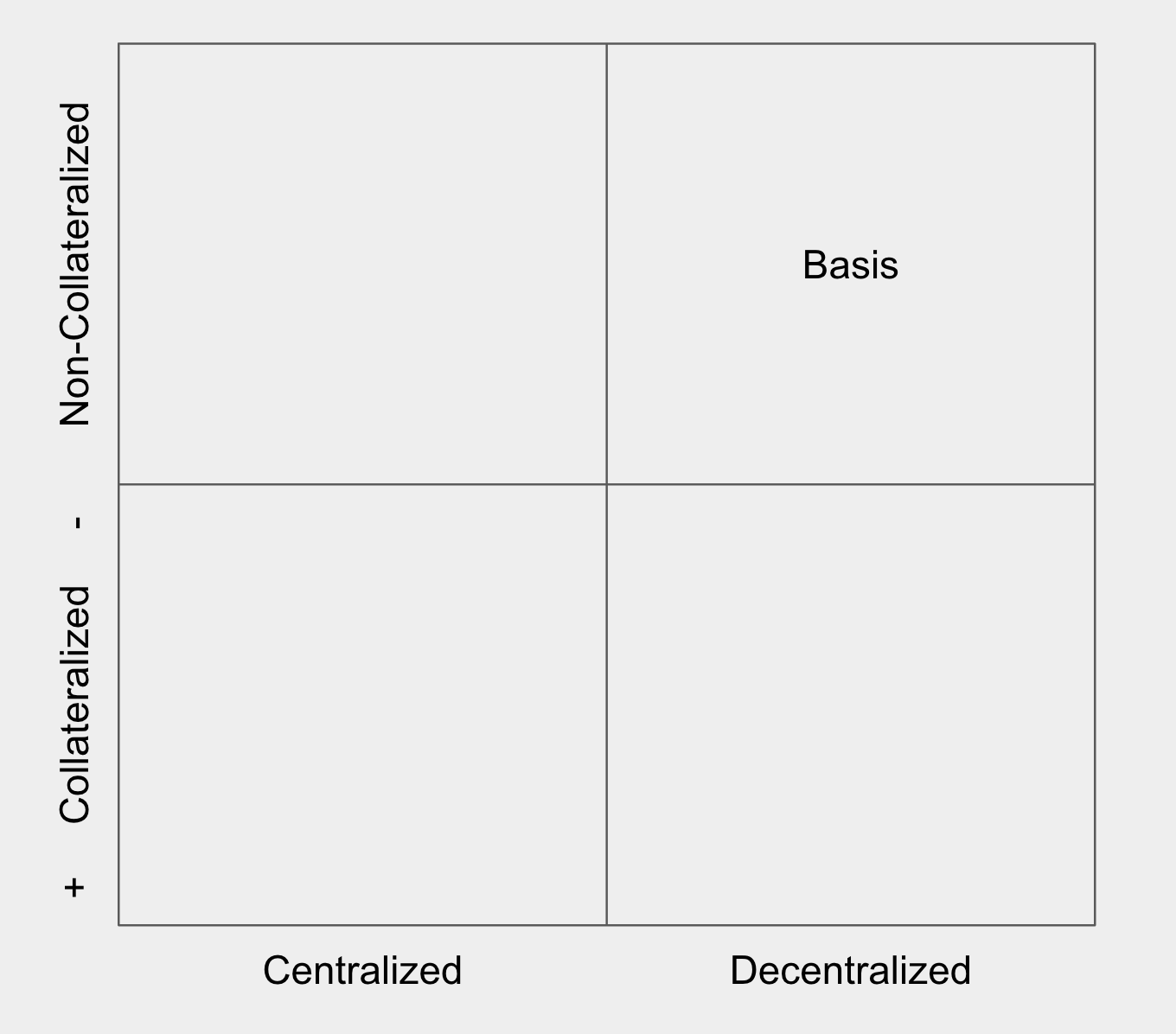 The most prominent of the decentralized, collateralized stablecoins is DAI which takes cryptocurrency as collateral and issues DAI against the collateral. The reason that it is at the bottom of the graph is that DAI uses overcollateralization in order to give the system a sufficient margin of safety in the event the price of the underlying collateral drops.