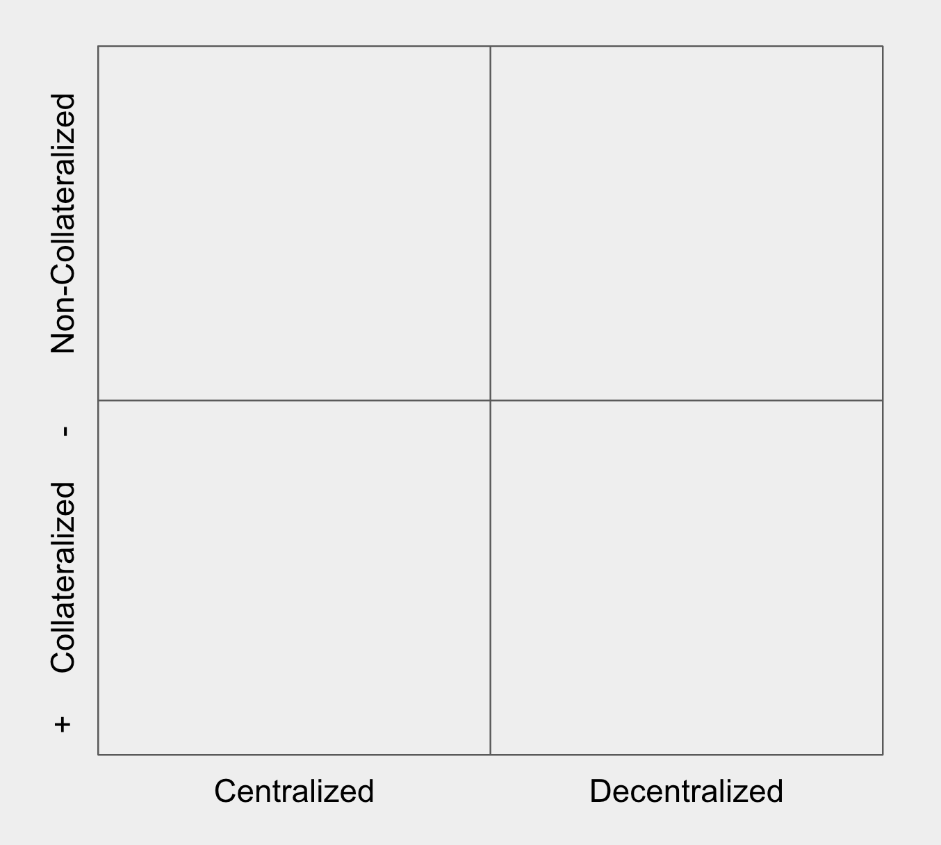 While the two models presented above are useful when thinking more deeply about stablecoin design decisions, the simplest way to understand stablecoins is to think of them on a 2x2 matrix of centralization/decentralization and collateralized/non-collateralized.